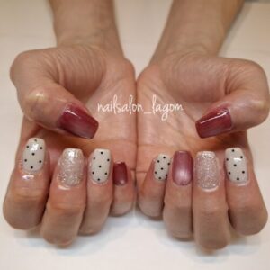 ジャッキークリームにブラックのホロを並べたドットネイル☆ マグネットはレッド、フラッシュはコーラル系でガーリーな配色に! 配置を左右で少し変えています♡ マグネット(ドライケア) ¥5500 当店オフ(付け替え・1ヶ月以 […]